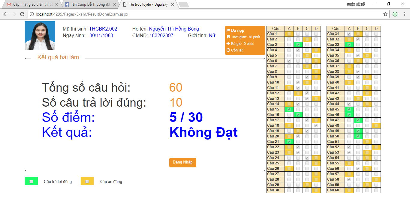 Sau khi làm bài xong, thí sinh có thể tự kiểm tra lại kết quả bài làm của mình, với phần đáp án được tô màu cam, phần trả lời đúng với đáp án được tô màu xanh lá. Chức năng này cũng có thể giúp cho giám thị chấm bài kiểm tra dễ dàng hơn.
