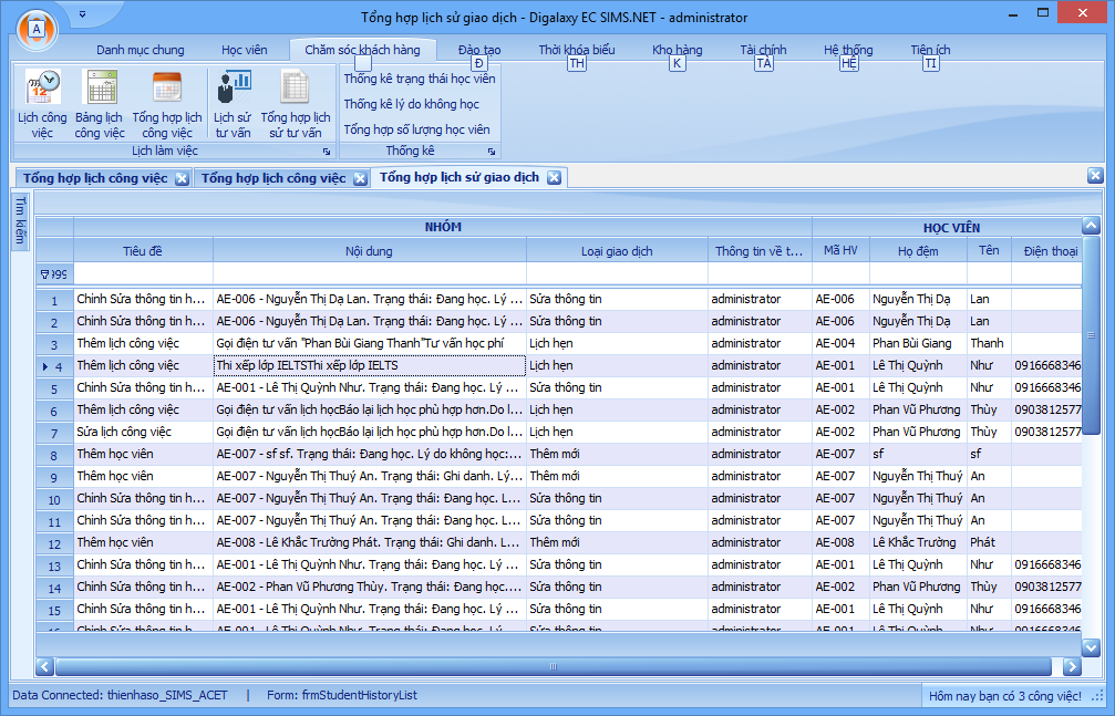 Lịch sử giao dịch với học viên, thông tin kết quả tư vấn, tình trạng đánh giá,... mọi thứ đã được cập nhật lưu trữ khoa học.